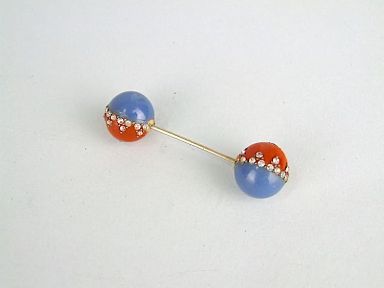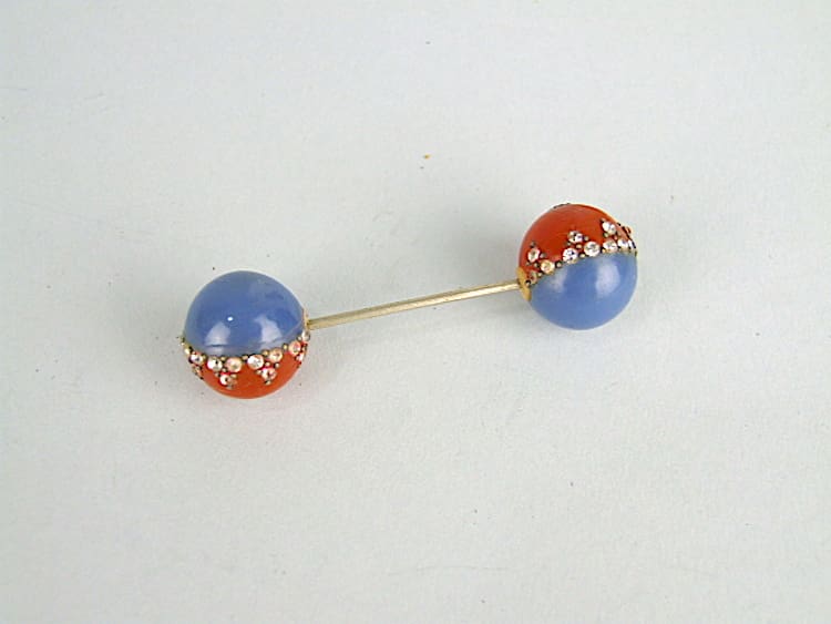 Blue and orange galalith screw end hatpin. Made by the Bengel company in the early 1930’s.