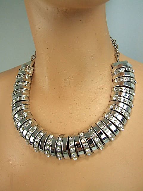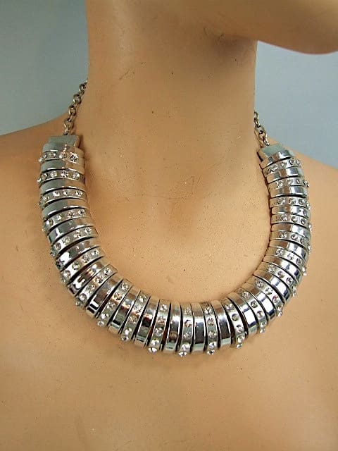 Silvered or polished metal and diamonte Egyptian themed collar necklace.