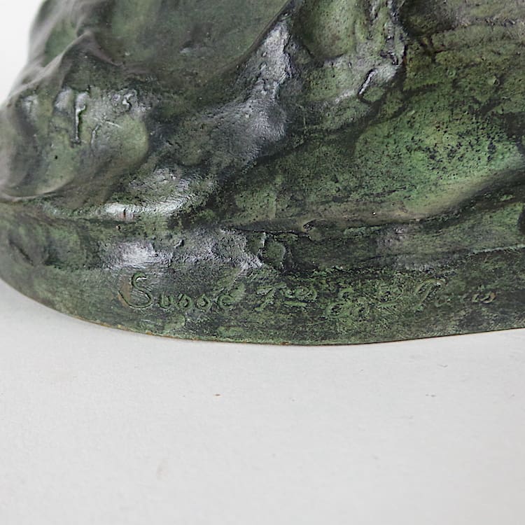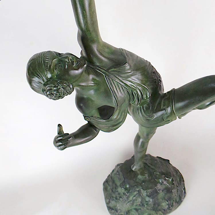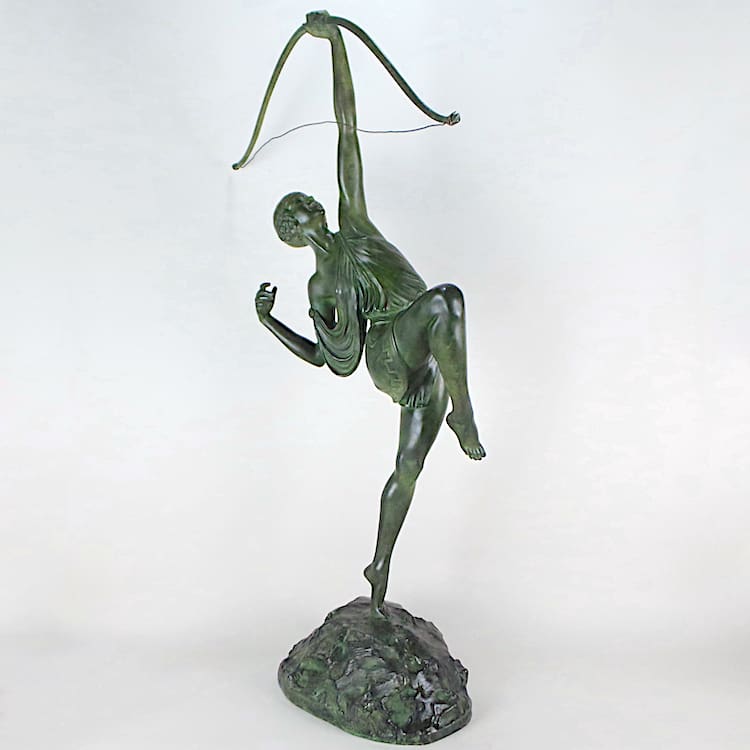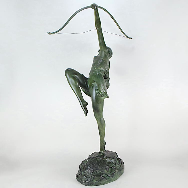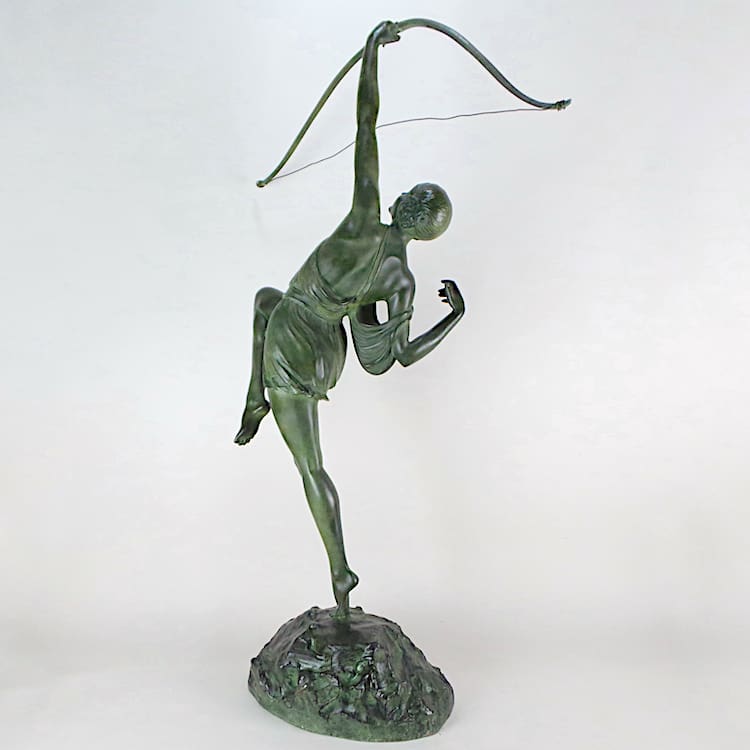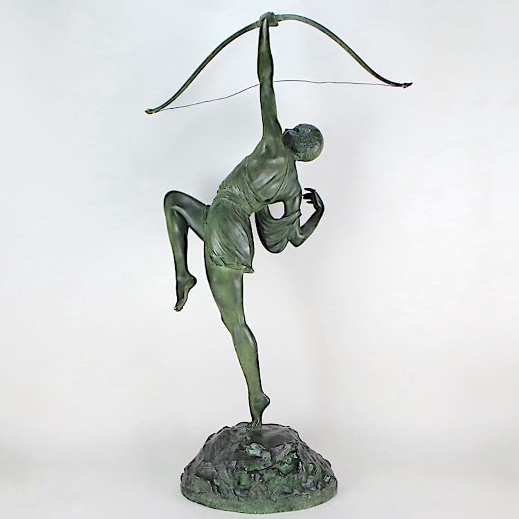 Diana the huntress is the mythological huntress, cast c1925 by Susse Freres, wearing a tunic with Greek key detailing, holding a bow and standing on one foot as if having just shot an arrow into the sky, the bow unscrewing in two places, the shaped ‘rocky’ base is signed ‘Le Faguays Sclp’ and ‘Susse Frs Ed Paris’, and bears a Susse Freres foundry mark.