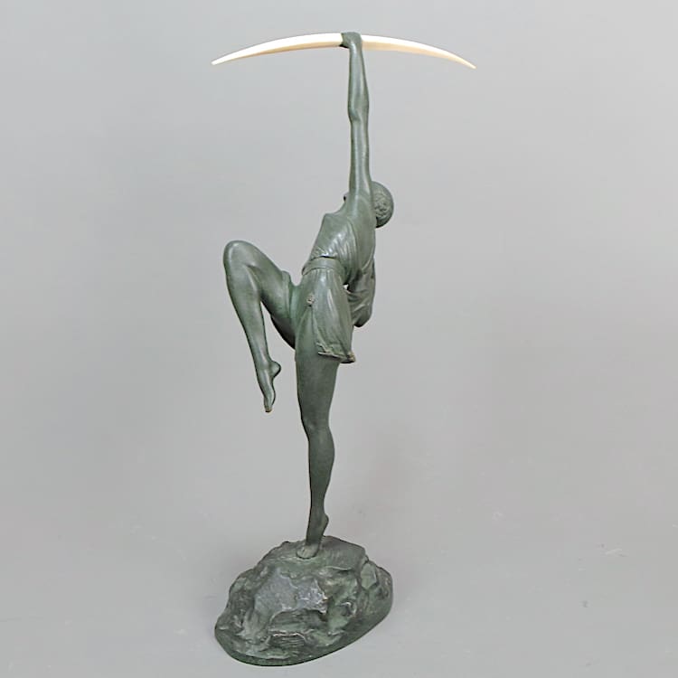 French Art Deco dark green patinated bronze statue of Diana the huntress holding an ivorine bow.