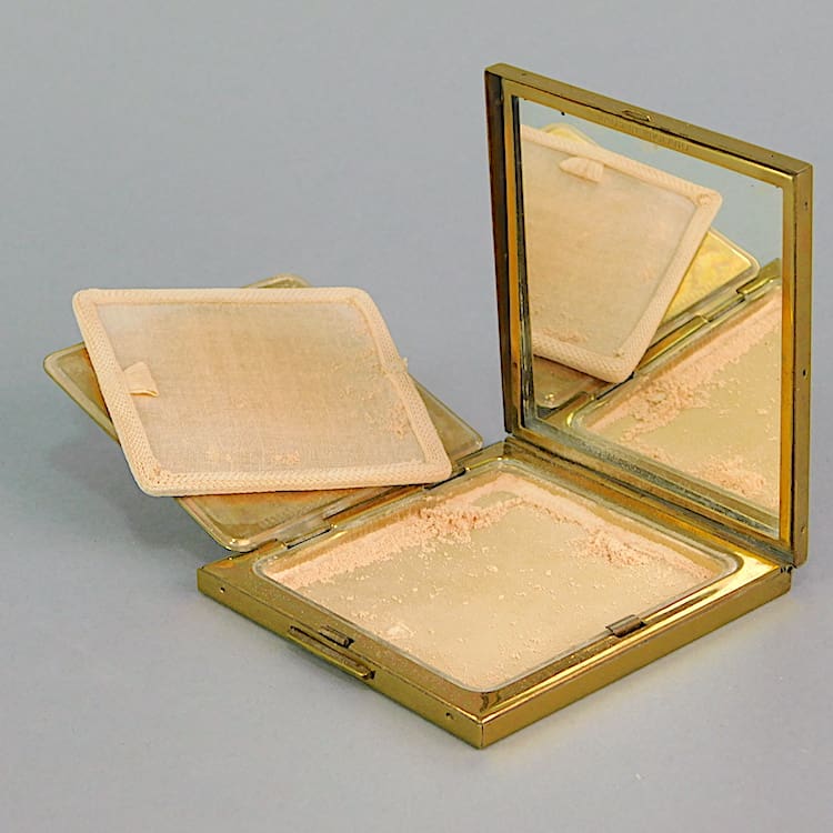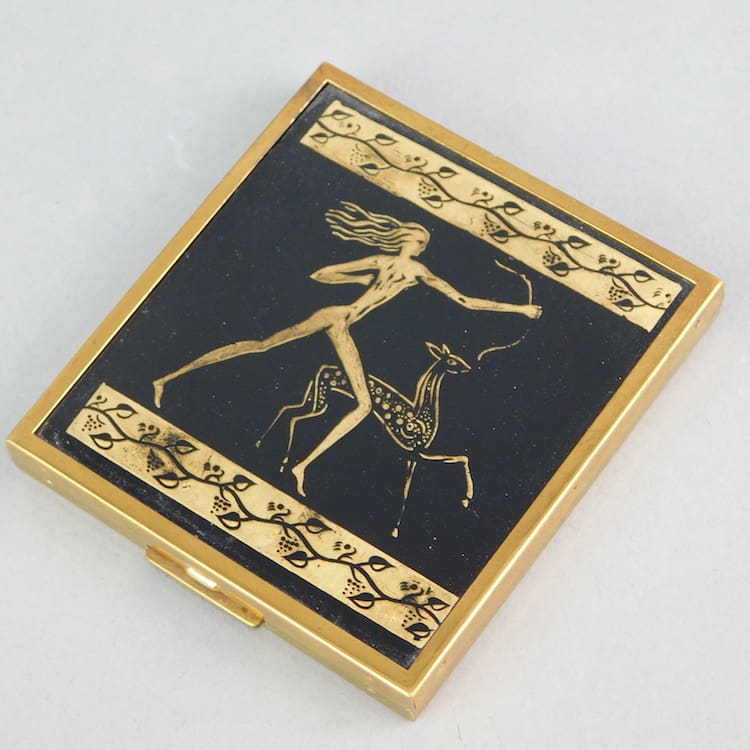 A large English art deco Diana powder compact, probably dating to the late 1940s. With a Diana with bow and deer to the lid. Inside is a mirrored lid and lidded powder section with its original mesh.