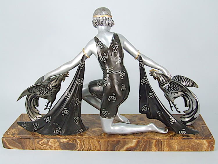 A large spelter and brown onyx group of Diana and a pair of fighting cockerels – all with their original dinanderie.