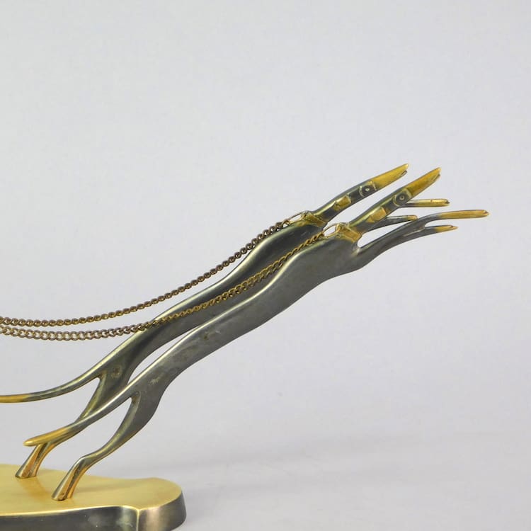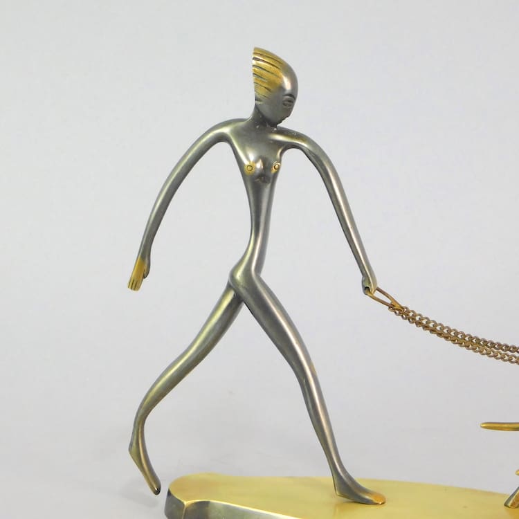 Austrian bronze figural group in Hagenauer style but unsigned. Nude Diane and 2 dogs.