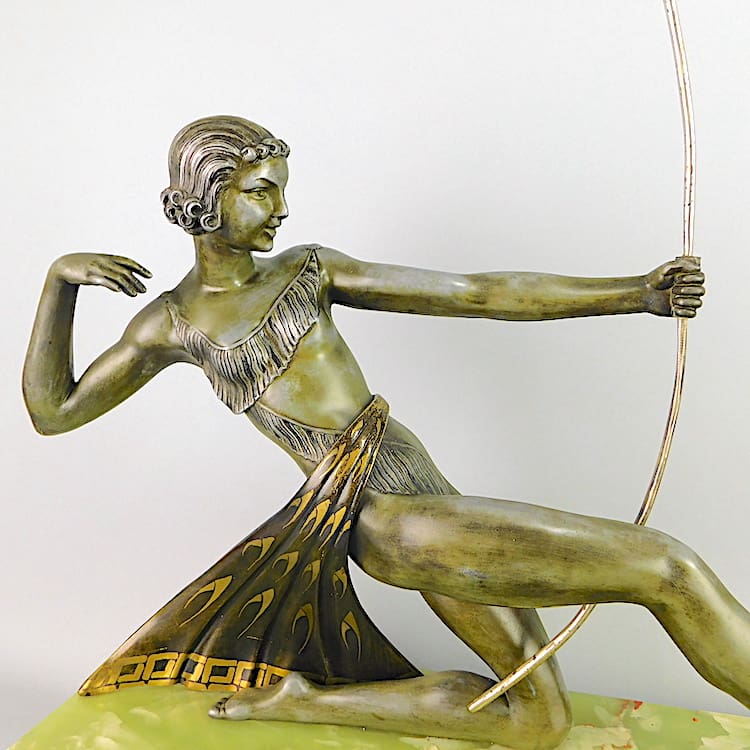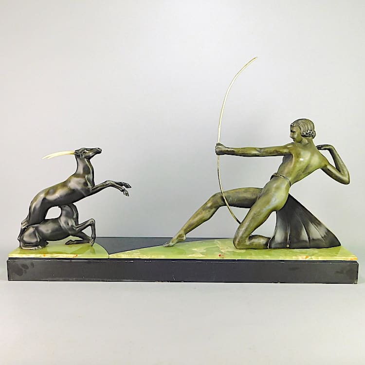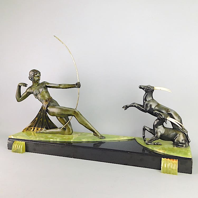 French art deco spelter Dianne the Huntress figural group by Uriano but unsigned.