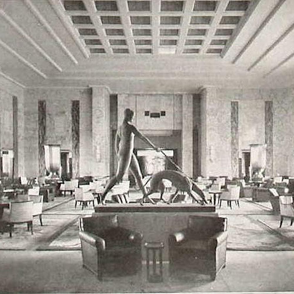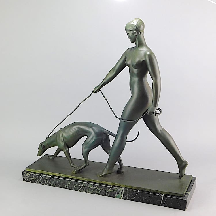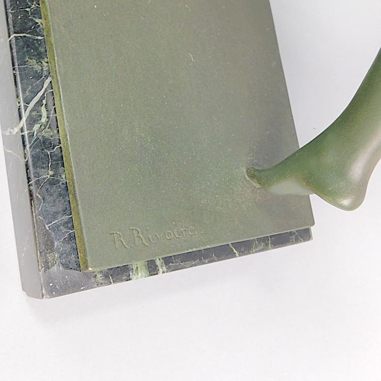 French Circa 1930 green patinated bronze large size iconic sculpture by Raymond Leon Rivoire (1884 – 1966). Signed in the bronze. Foundry marks “Susses Freres Paris” + foundry stamp. A life size version of this same sculpture was exhibited in the french “Atlantique” ocean liner “Grand Salon” in the 1930s. It is standing on a verdegre marble base.
