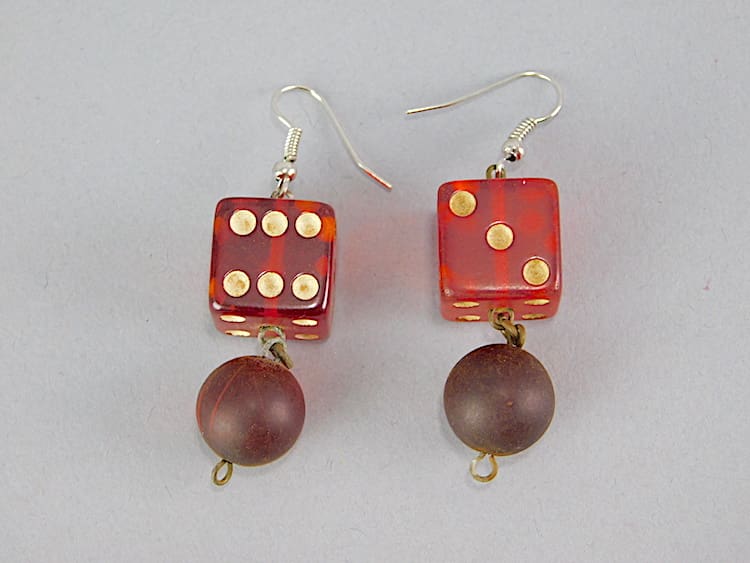 Red lucite dice earrings, made for pierced ears and fitted with new silver hooks. Similar ones can be seen in the Bengel 2 book on page 88.