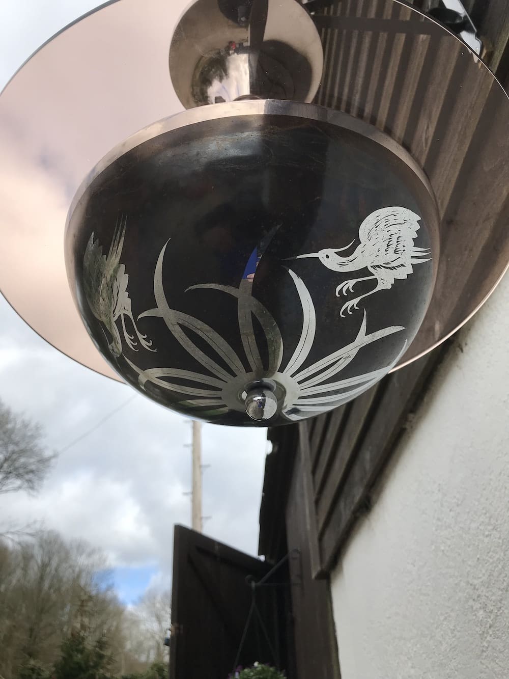 French art deco modernist chrome ceiling lamp with bird dinanderie detail. It has a peach glass saturn ring. Unsigned but probably Docobu.