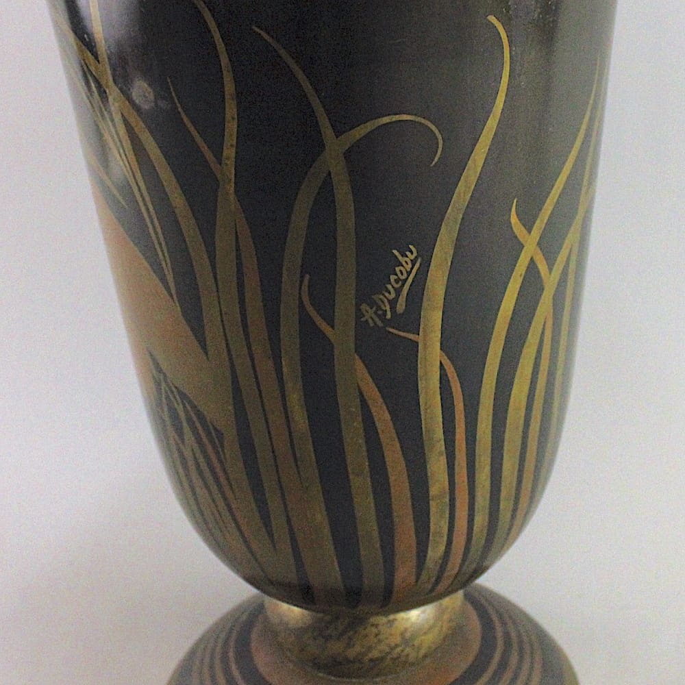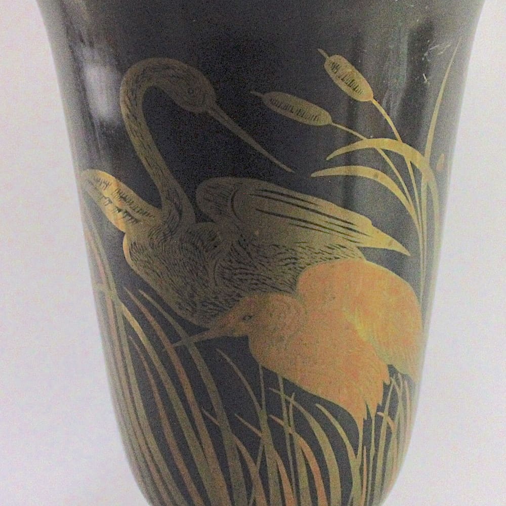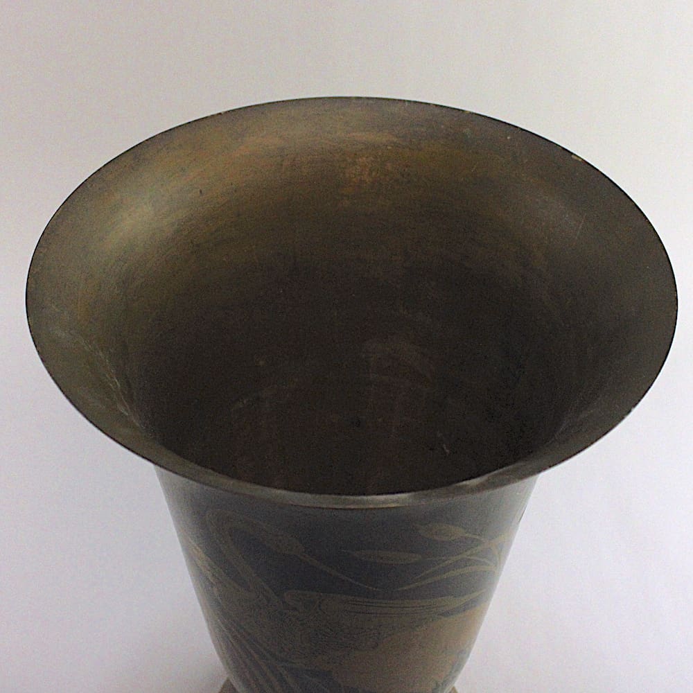 Large French art deco metal vase with herons and bullrush patterning in gold and copper colouring.
