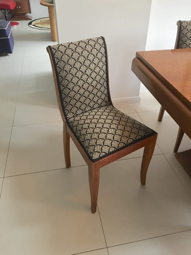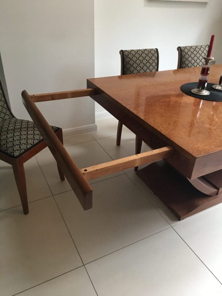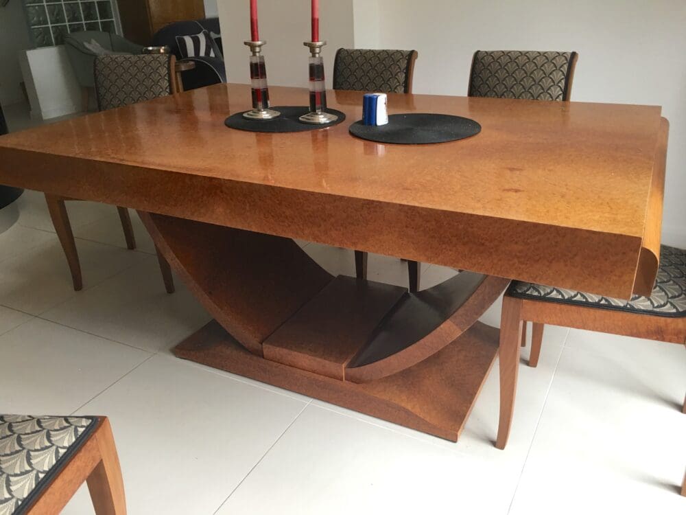A quality French art deco amboyne and beech extendable dining room table and six chairs.