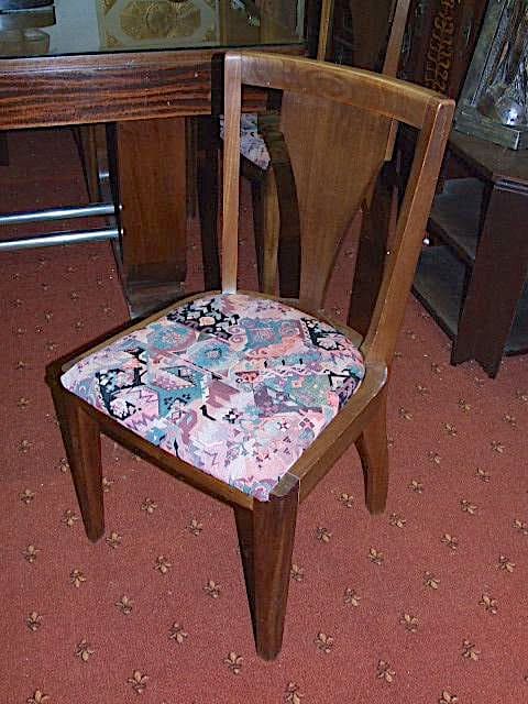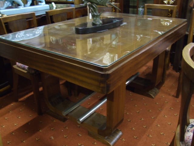 Teak dining room table and 6 chairs. Made in Belgium by the Decoene company during the 1930’s. Comes with glass top panel, chairs are covered in deco fabric. Twin chromed brass tube supports. Comes with an extra leaf to extend table.