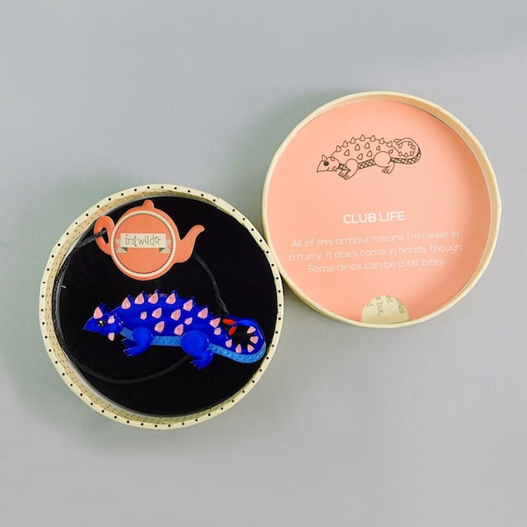 Club Life dinosaur brooch by Erstwilder. Signed to the back and comes with its original gift box and label. Fitted with a roll safety clasp.