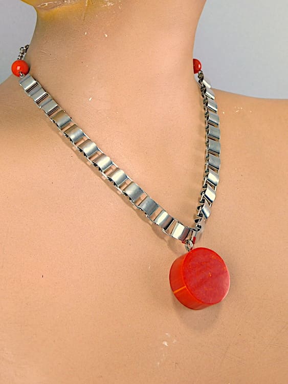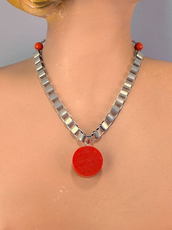 Intricate tubed links chain with red galalith beads and central chunky disc. Made in the early 1930’s by Jakob Bengel.