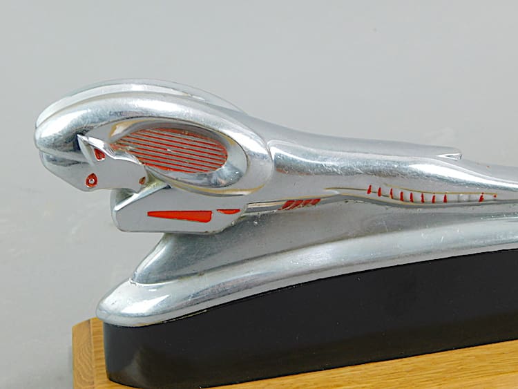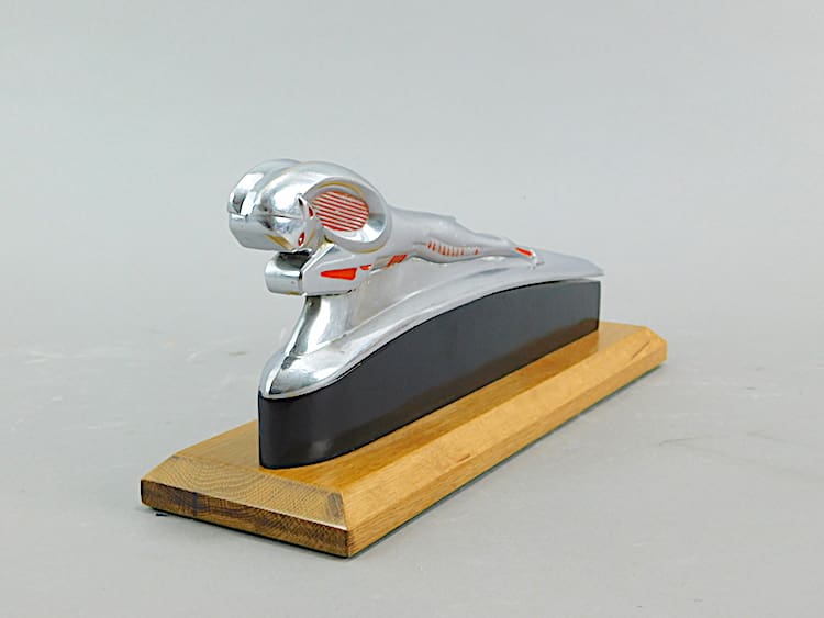 American art deco chromed metal car mascot (hood ornament) with red enamel detailing. Originally from a 1948 Dodge car. Now mounted on a teak and black ebonised base.