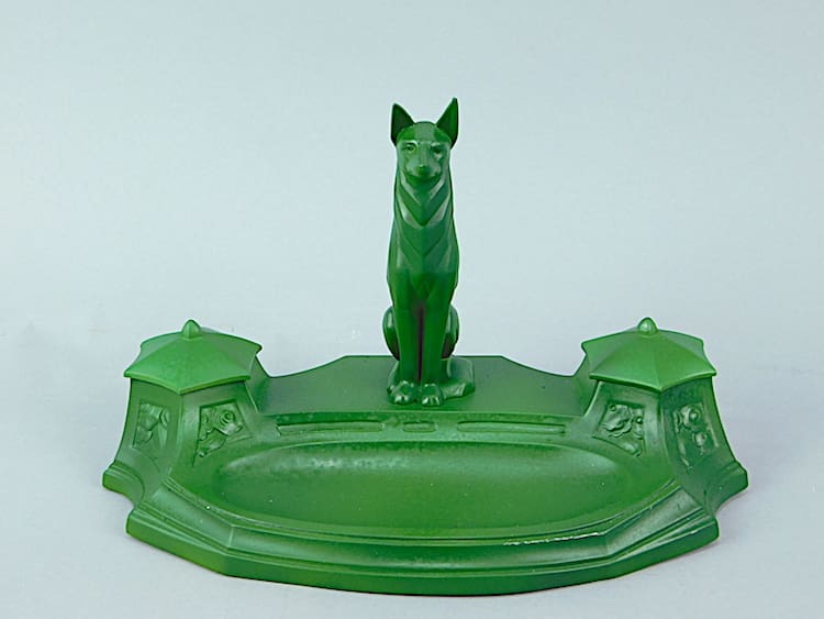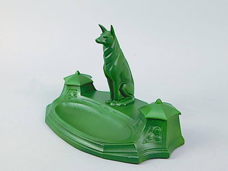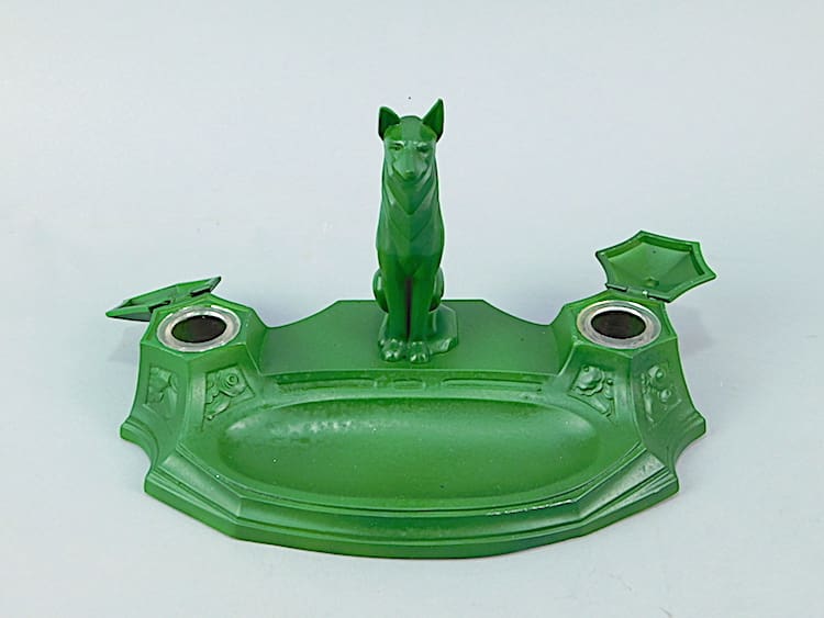 French spelter dog desk tidy with an inkwell to either end. Signed under the base with chips to the inkwell glass inserts edges. By Orfevrerrie Dilecta.