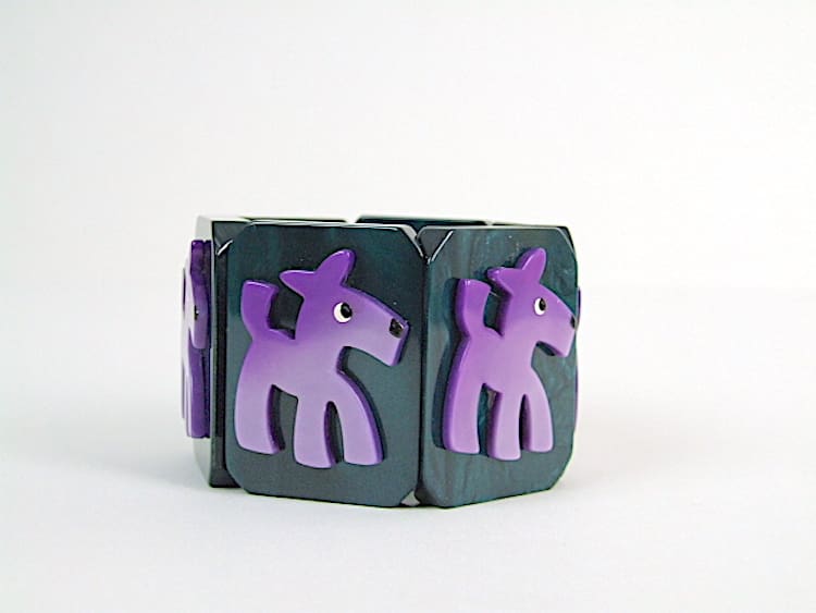 Rare French vintage green and purple galalith art deco dogs stretch bracelet.