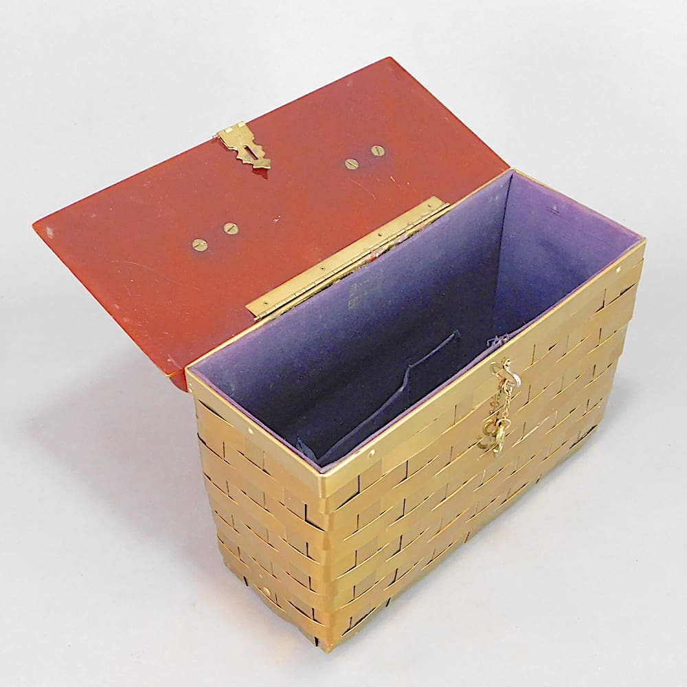 American gold metal basket weave bag with phenolic tortoise shell lid and lucite handle. I believe made by Dorset Rex but no label (which often fall off) in the late 1940’s – early 1950’s. It bears an indistinct shop stamp to the interior – Barret Fifth Avenue. The catch is the typical Dorset Rex S and hook type with a safety chain.