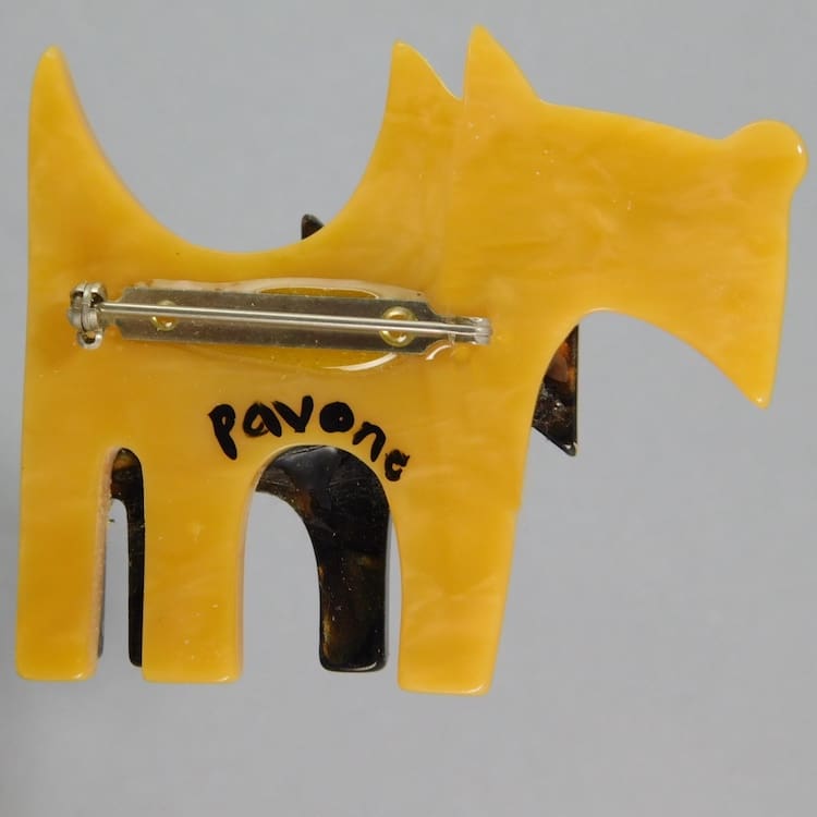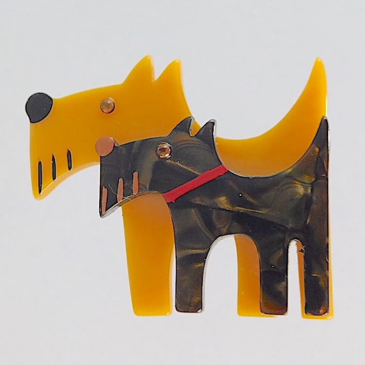 French vintage galalith hand painted double dogs brooch by Marie-Christine Pavone.