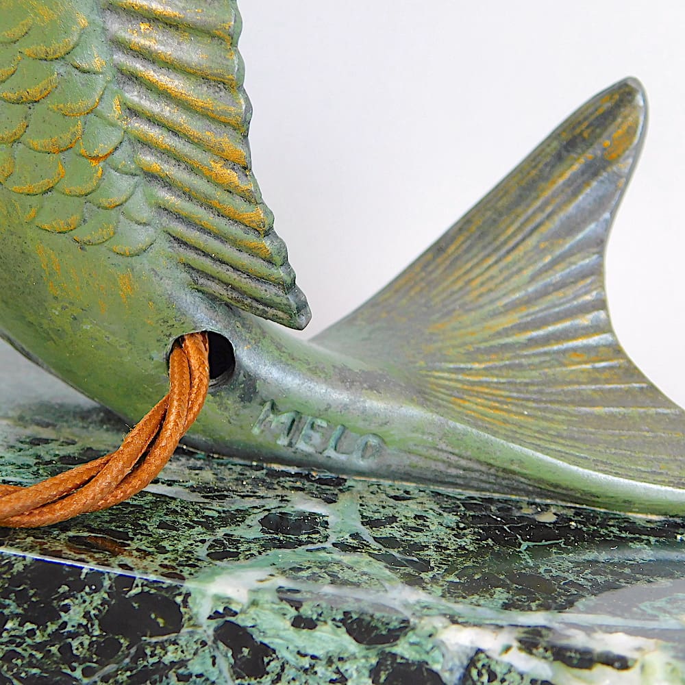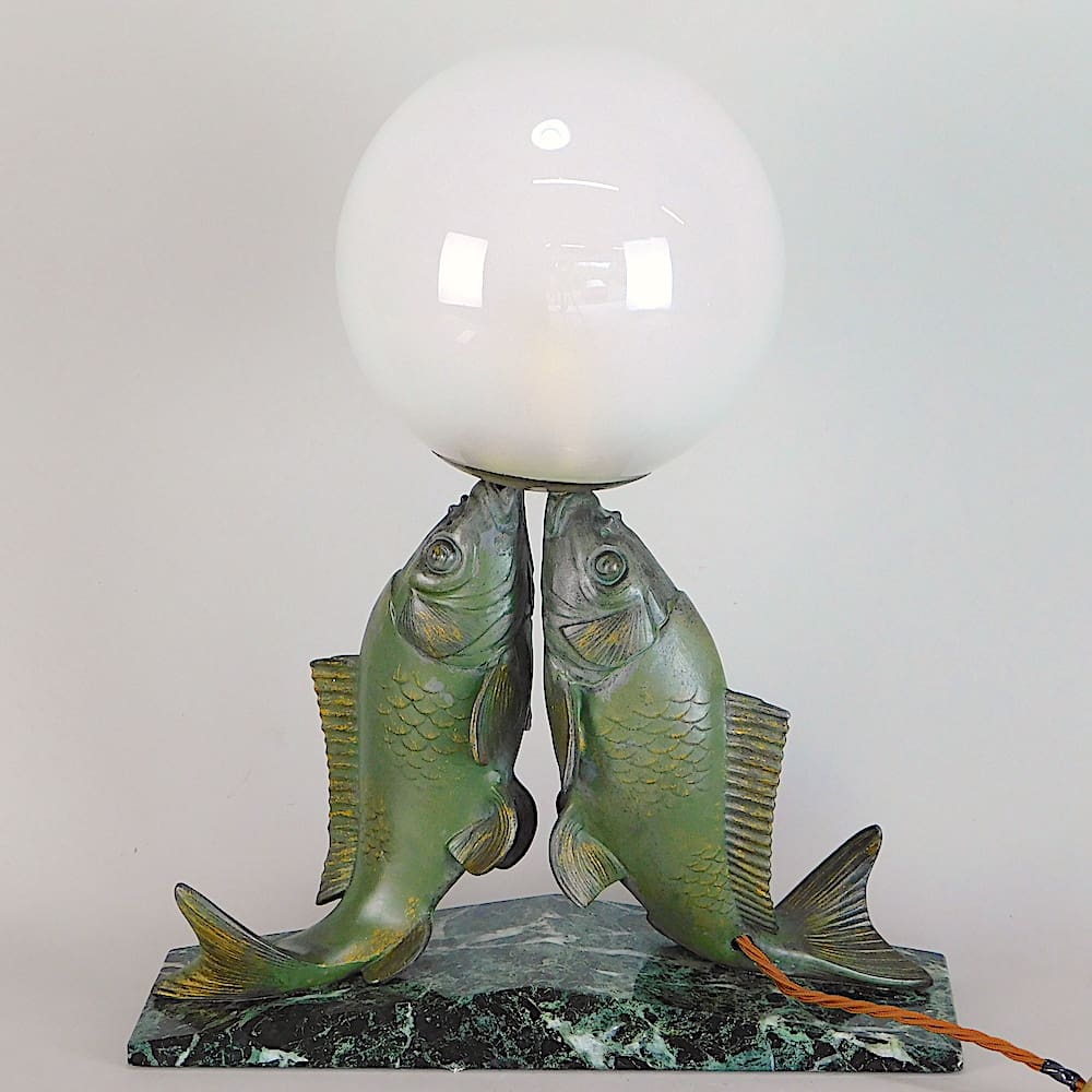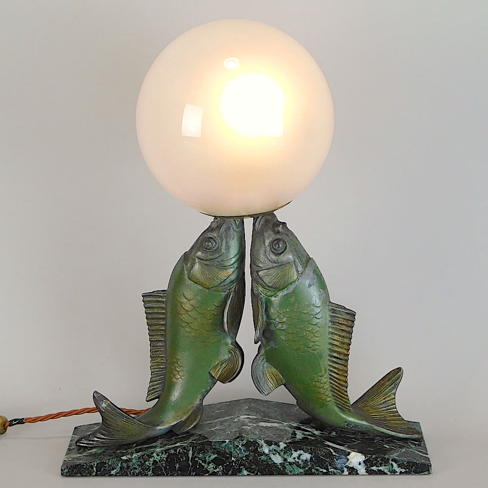 Rare spelter art deco double fishes lamp by Melo, a pseudonym used by Lemoine.