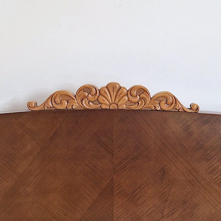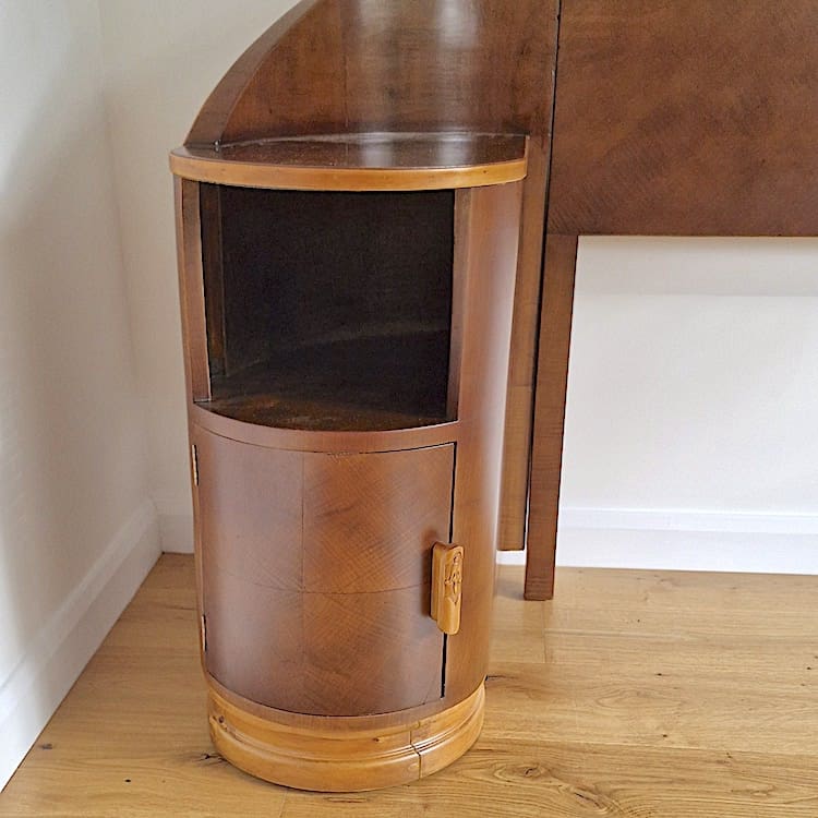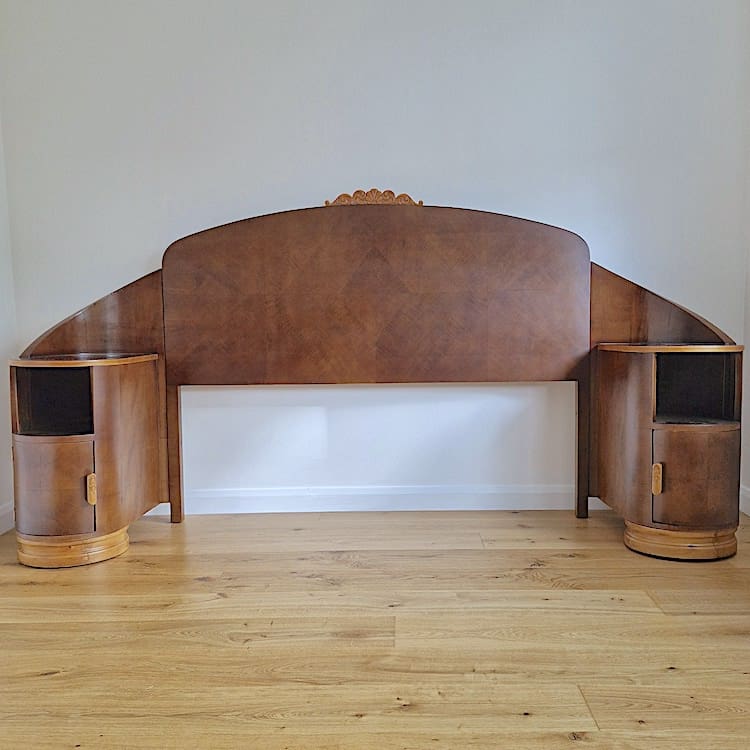 Large curved English art deco walnut double headboard with integral bedside cabinets.