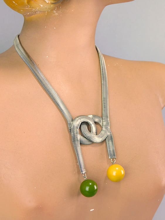 The largest of the snake chains, this one with a double knot next to each other. Yellow and green galalith balls.