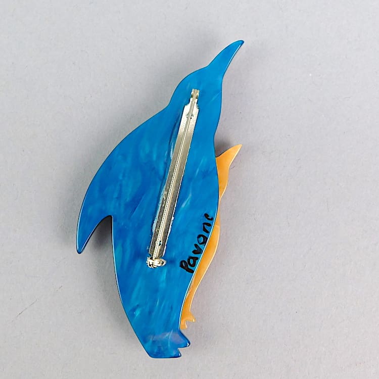 French hand made and signed vintage galalith double penguin brooch by Marie-Christine Pavone.