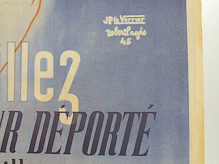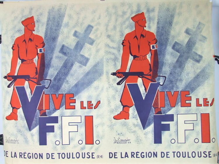 French double sided resistance poster by Jean-Paul Le Verrier. Signed and dated 1945 Toulous. There is a similar poster in the Toulouse Museum. To the front it reads – Accueillez Un Travailleur Deporte. To the back (see the listing below) is two Free French posters – Vive les FFI de Toulouse. This poster has come from the archives of the Le Verrier family.