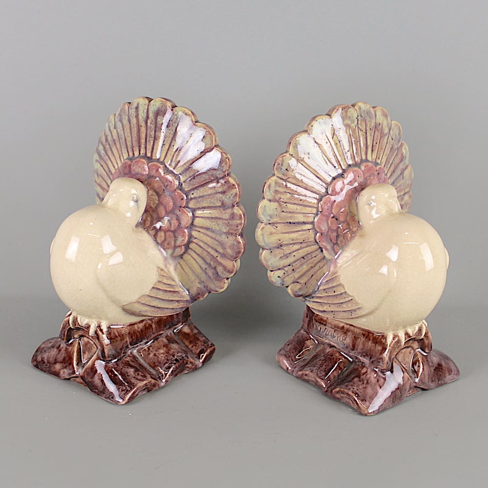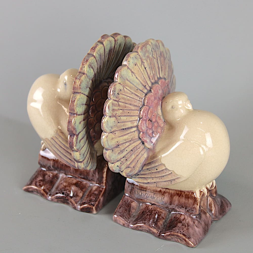 French white terracotta bookends – each modelled as doves on a pantile rooftop.