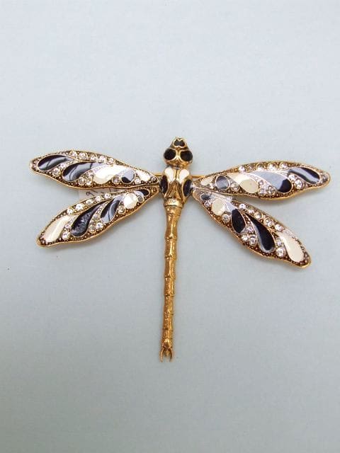 Large enamel art deco dragonfly brooch with diamontes. Fitted with a sliding safety clasp.