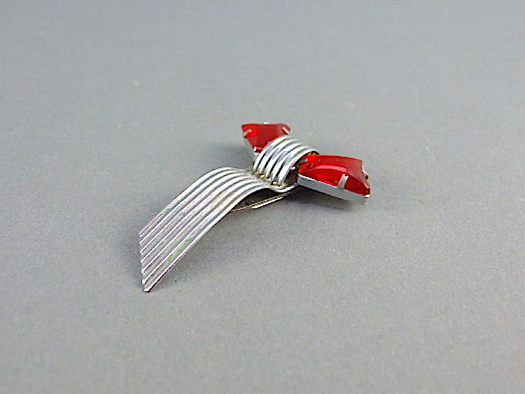 Chrome and red glass dress clip. Made by Bengel in the early 1930’s.