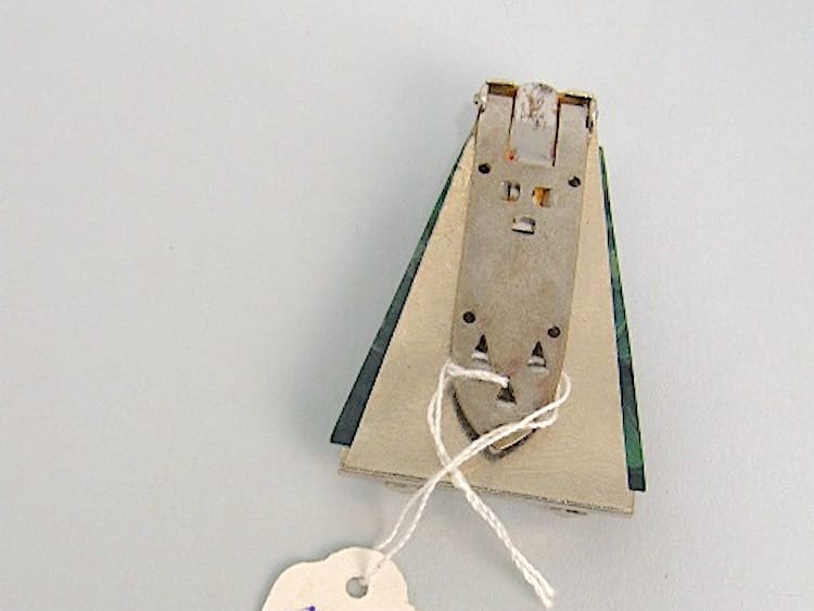Marbled green galalith dress clip with chrome detail.
