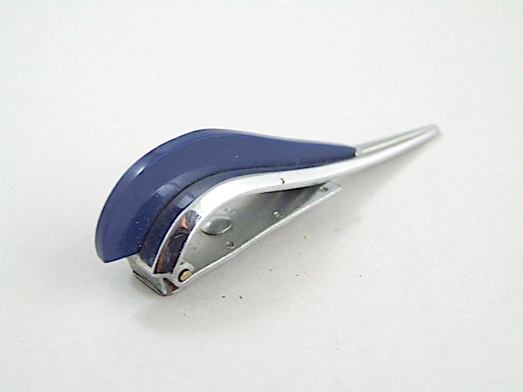Art deco navy galalith and chromed metal modernist dress clip. Made by Jakob Bengel company for LW Paris (signed to the clip) in the early 1930s.
