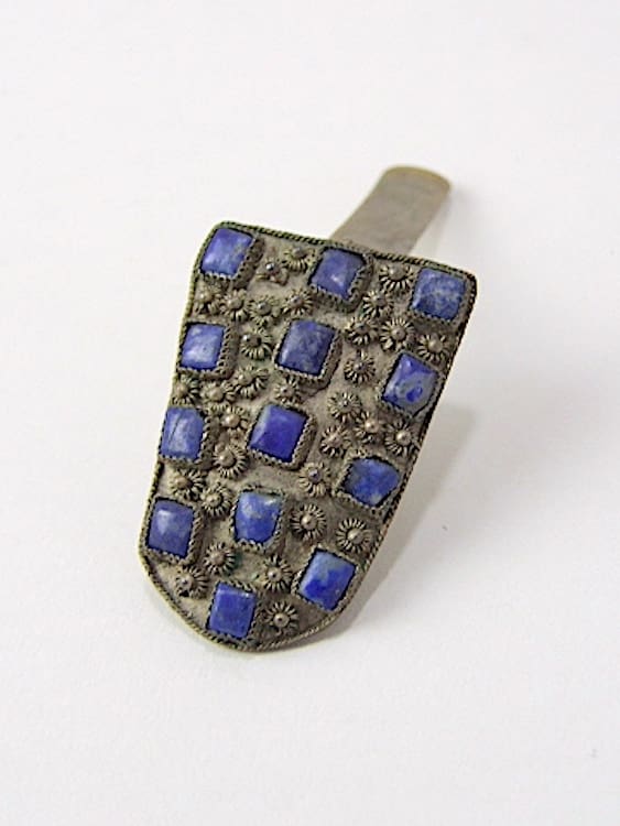Blue stones mounted on silver background with sprung holder on the reverse.