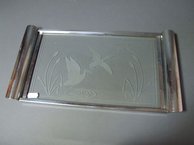 A four piece red and chrome enamel at deco dressing table set. Consists of 2 brushes, 1 comb and a tray which has a central glass panel with frosted flying ducks pattern.