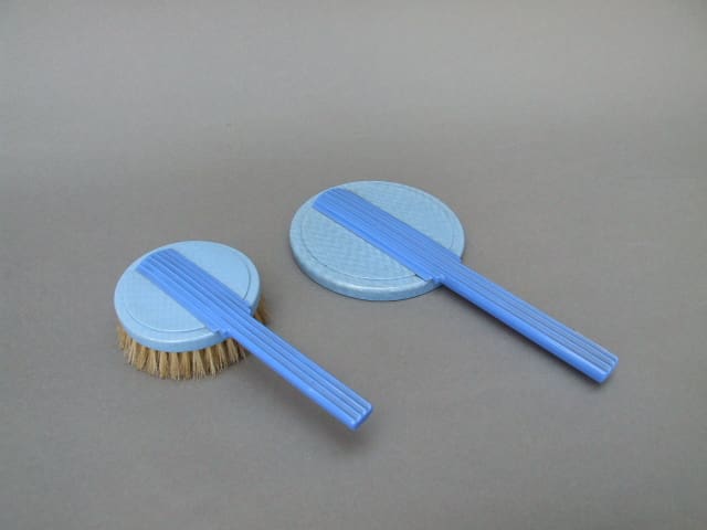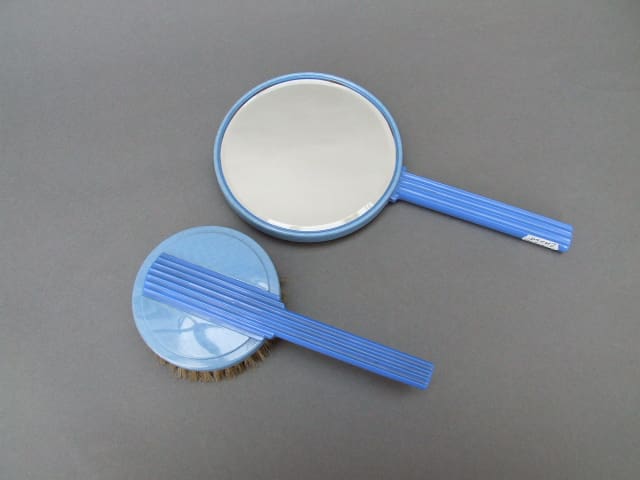 English phenolic two tones blue dressing table set. Consists of a hand mirror and brush, in good vintage condition.