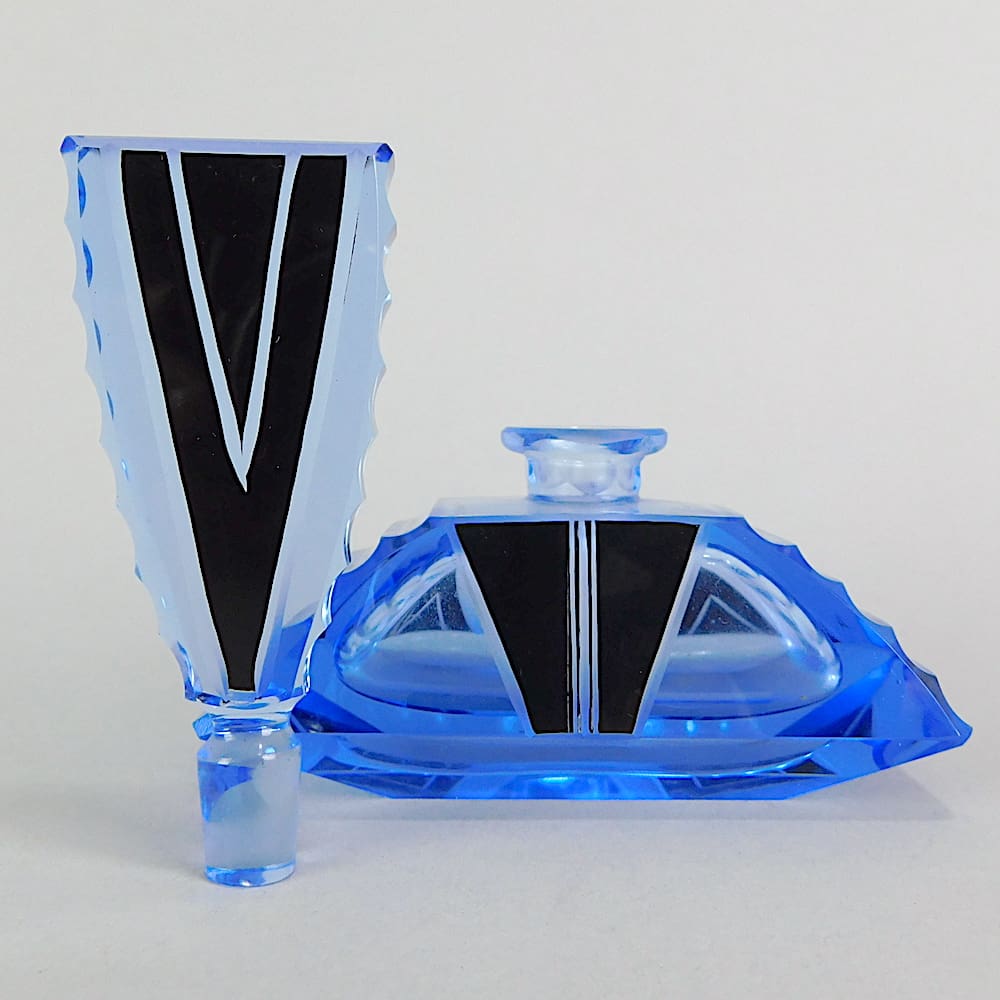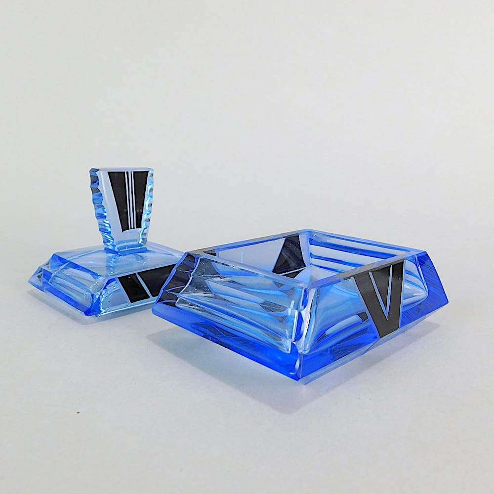 Three piece blue tinted Czech glass dressing table set. It has Palda style black enamel detail, and comes with a trinket dish, scent bottle and powder bowl.