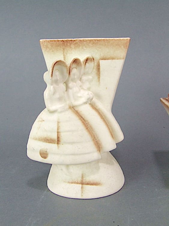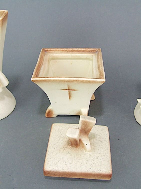 German 3 piece art deco vase set for the dressing table with speckled and crackle glazing – with two vases and a lidded trinket dish. All pieces marked with the Goebel markings. Two vases, one with ladies in crinoline dresses the other with men in top hats and a central lidded dish.