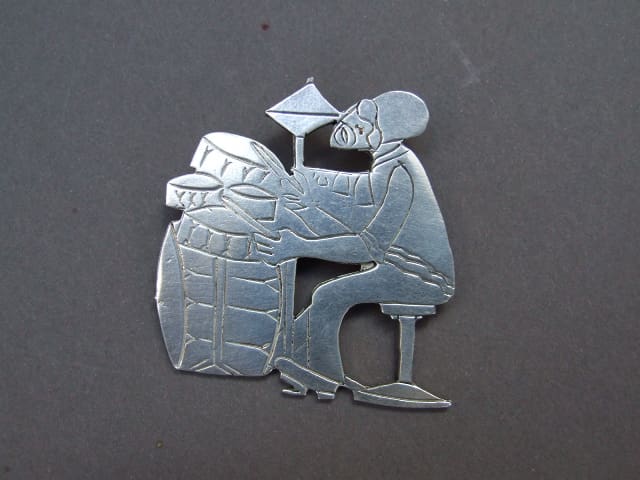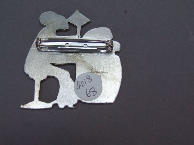 This chrome drummer brooch is from a vintage range called Ferraggioli, which was made by Pierre Bex in the early 1960’s. Fitted with a roll safety clasp and signed Ferraggioli to the reverse.