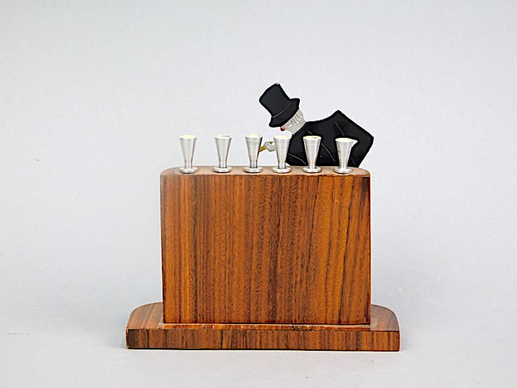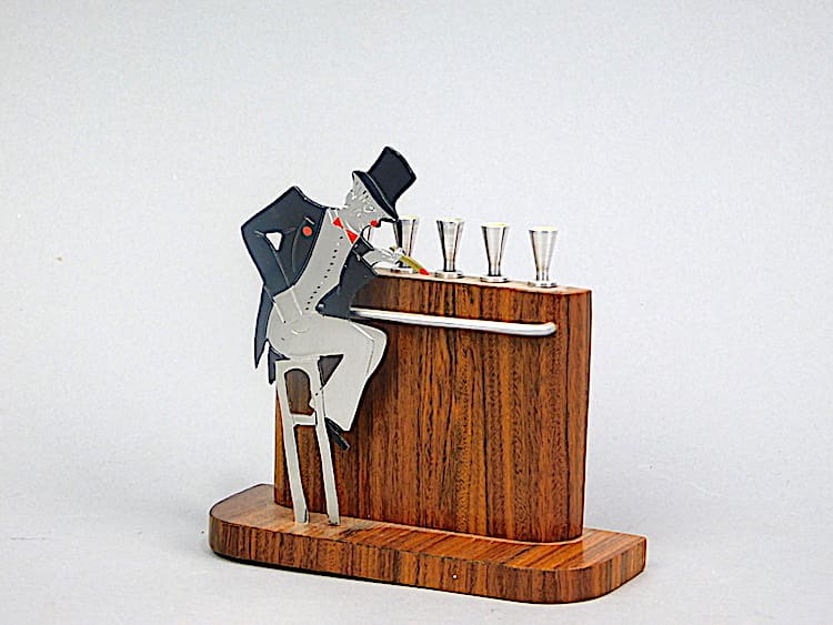 French art deco hand painted, unsigned Sudre cocktails sticks set. The glasses on the bar are the cocktail sticks.
