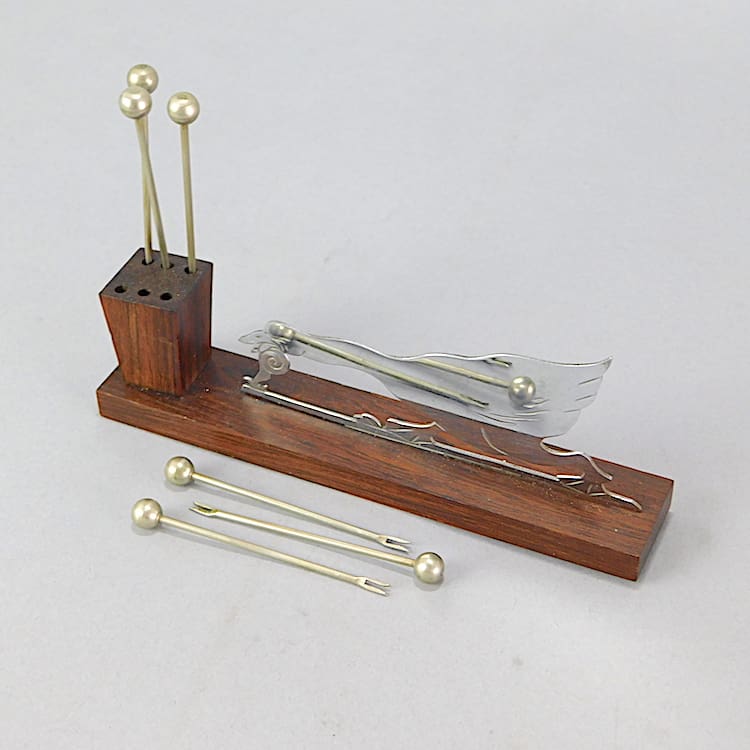 French cocktail sticks set designed by Benjamin Rabier. Macassar base with chromed duck catching a snail. 6 metal end cocktail sticks in the stand on the side.
