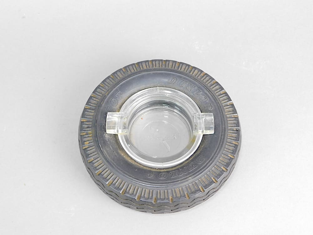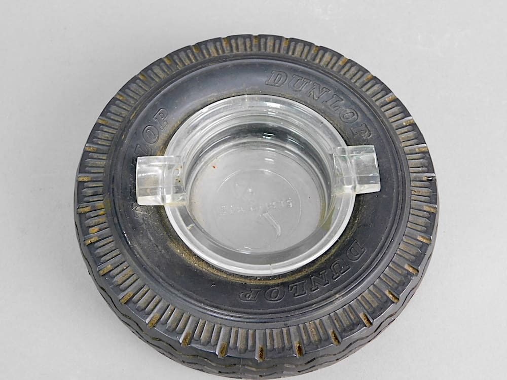 A Dunlop tyre advertising ashtray, these were made for use in tyre shops and car dealers on the counter. The tyre on this one reads Dunlop and the glass ashtray insert reads Semperit.