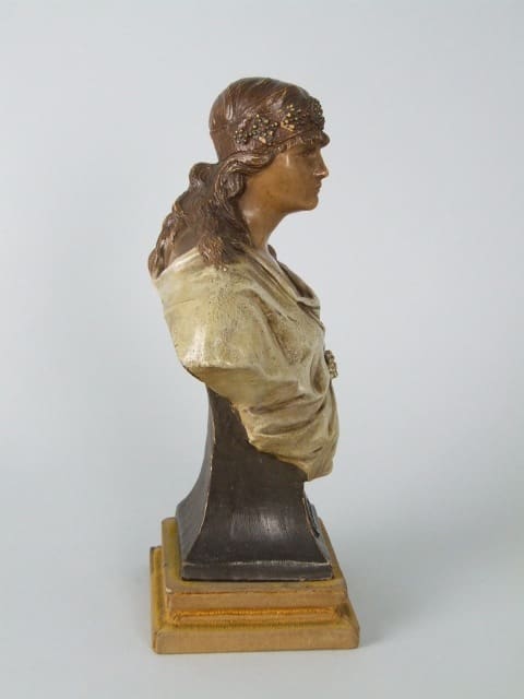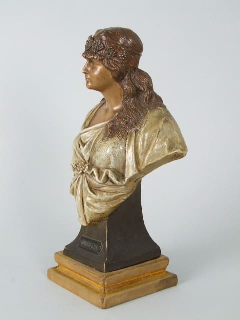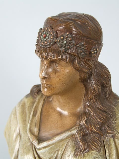 Rare small Judith bust by E. Tell for Goldscheider, circa 1900 and model number 852, with the Goldscheider mark to the back.