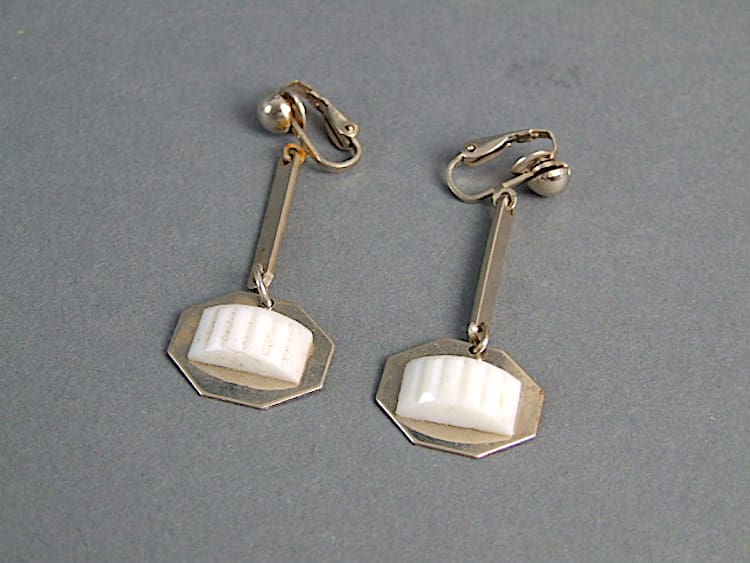White ribbed galalith and chrome clip on earrings made by Bengel in the 1930s.