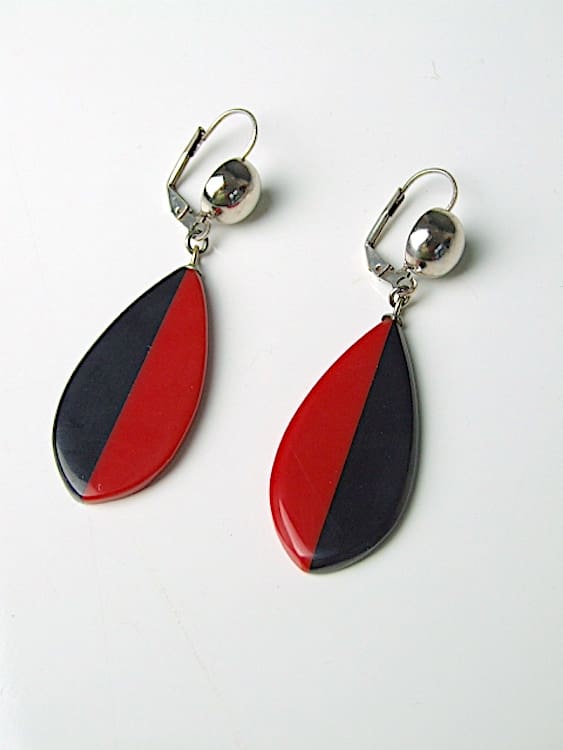 Red and black galalith earrings made by Bengel in the early 1930s. They are made for pierced ears.