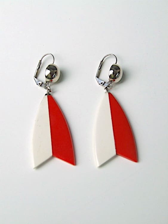 White and red galalith earrings made by Bengel in the early 1930s. They are made for pierced ears.