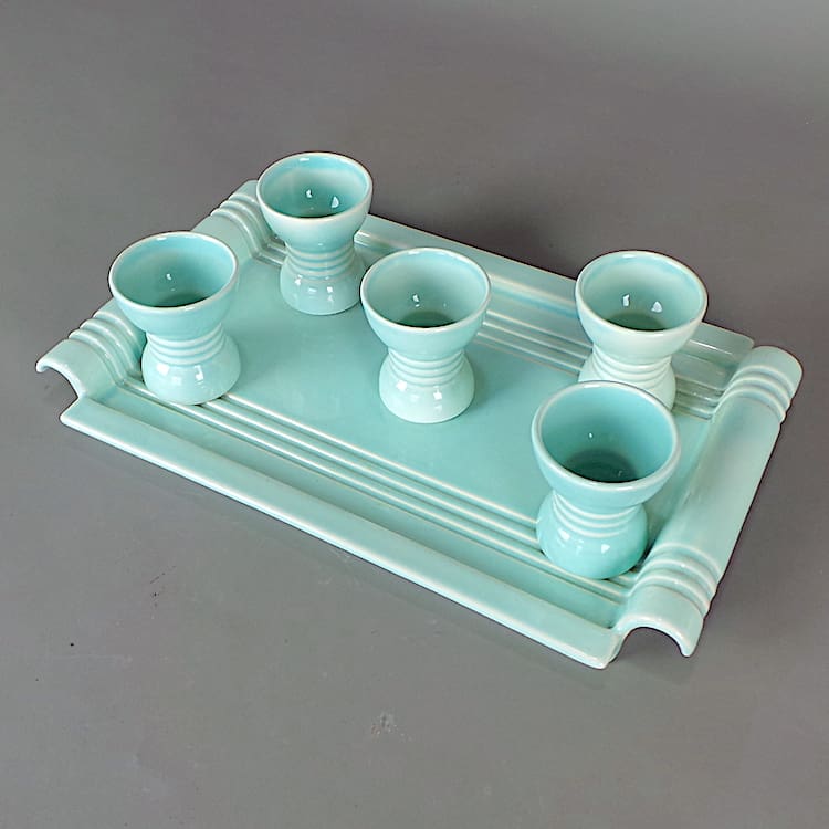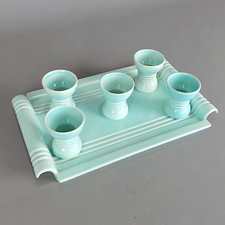 French Art Deco blue glaze egg cups set – tray and 5 cups.