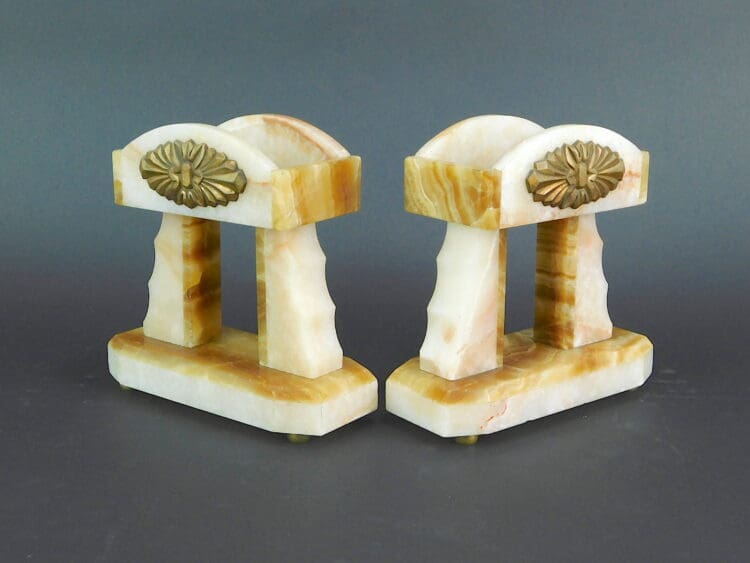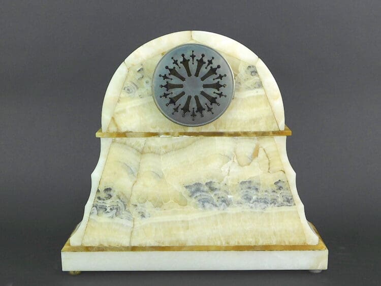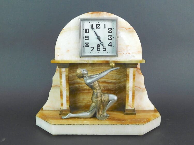 French spelter Egyptian themed lady dancer mounted on a cream onyx and toffee coloured marble and is supported by a pair of bronze column mounts.
