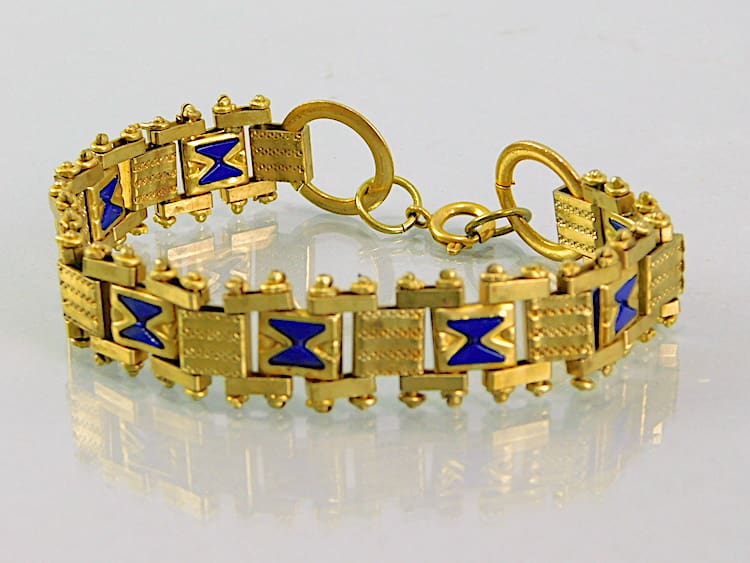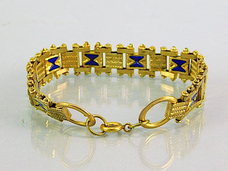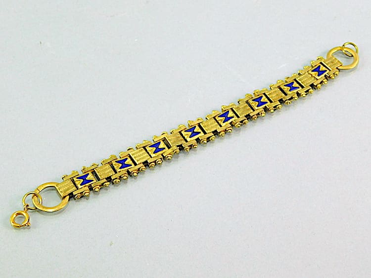 Gilt metal brick bracelet with inserts of navy blue galalith. Made in the early 1930’s by the German company of Jakob Bengel. This piece can be seen in the pattern books from the Bengel factory.