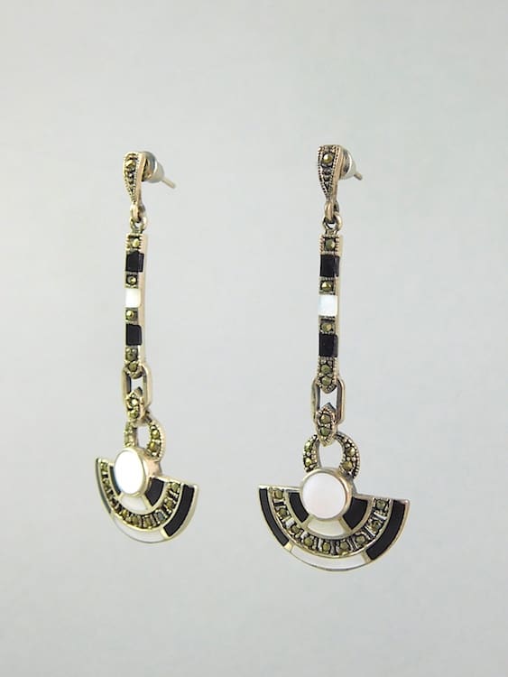 Silver and black onyx and pearl dangle earrings for pierced ears.