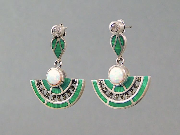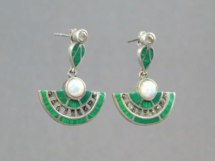 Contemporary silver, malachite and pearl silver earrings in Egyptian style. For pierced ears.