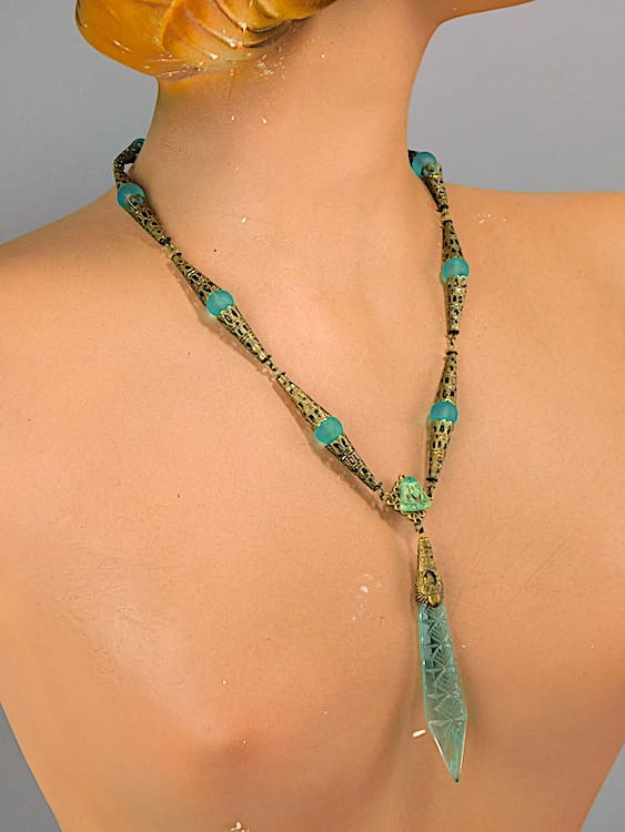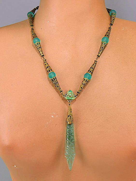 1920s Czechoslovakian filigree and glass flapper necklace. With an Egyptian theme – having a scarab beetle to the top of the glass pendant and a sphinx head to the to the top where it meets the chain.